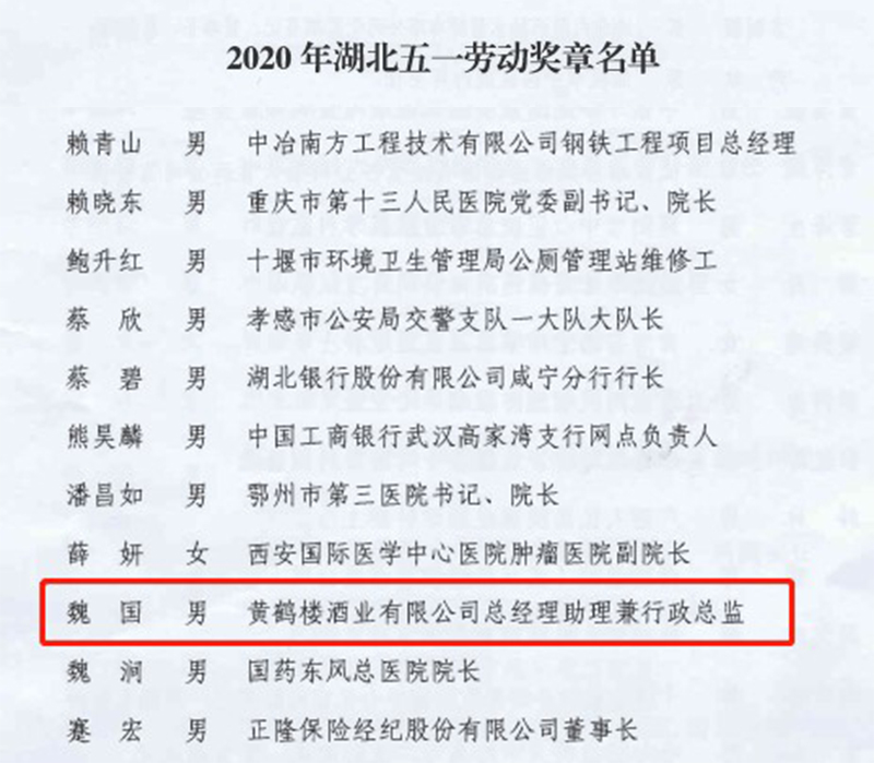 近日,湖北省總工會下發《關于表彰2020年湖北五一勞動獎和湖北省工人先鋒號的決定》。黃鶴樓酒業黨委委員、總經理助理魏國被授予湖北五一勞動獎章。