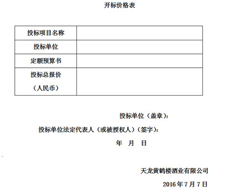 六、開標、評標、定標:由天龍黃鶴樓酒業(yè)有限公司另行通知。