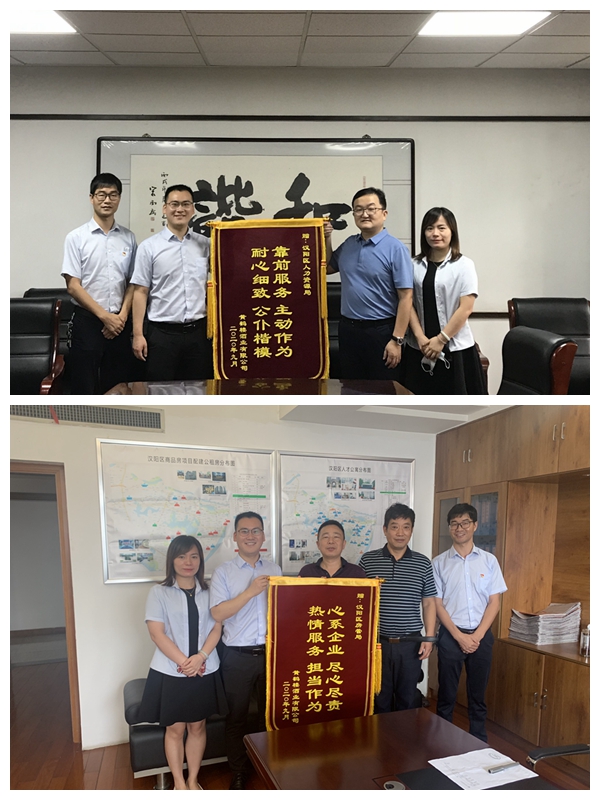 9月11日,公司人力資源中心總監(jiān)助理張佳一行分別前往漢陽區(qū)人力資源局、漢陽區(qū)房管局贈送錦旗,對兩家局機關長期以來在政策服務、問題協(xié)調等方面給予的支持表達感謝。漢陽區(qū)人力資源局就業(yè)局局長王鏑,漢陽區(qū)房管局黨組成員、副局長張偉龍及辦公室主任劉敏分別作為代表接收錦旗。