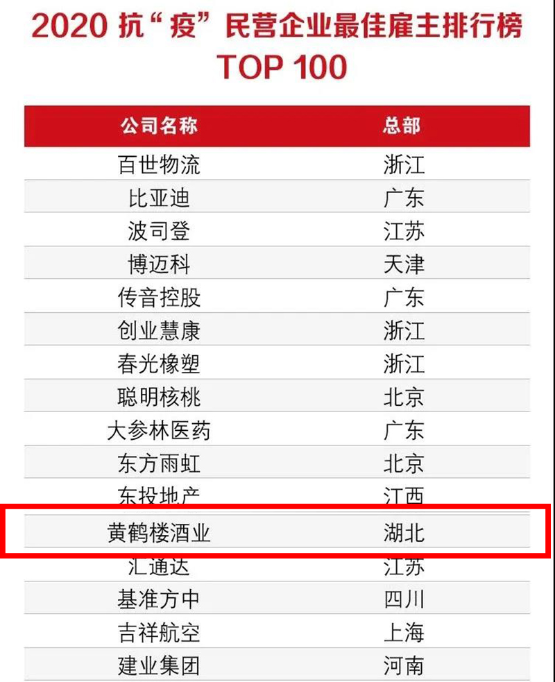 湖北唯一上榜企業 黃鶴樓酒業名列2020抗“疫”民營企業最佳雇主排行榜TOP100