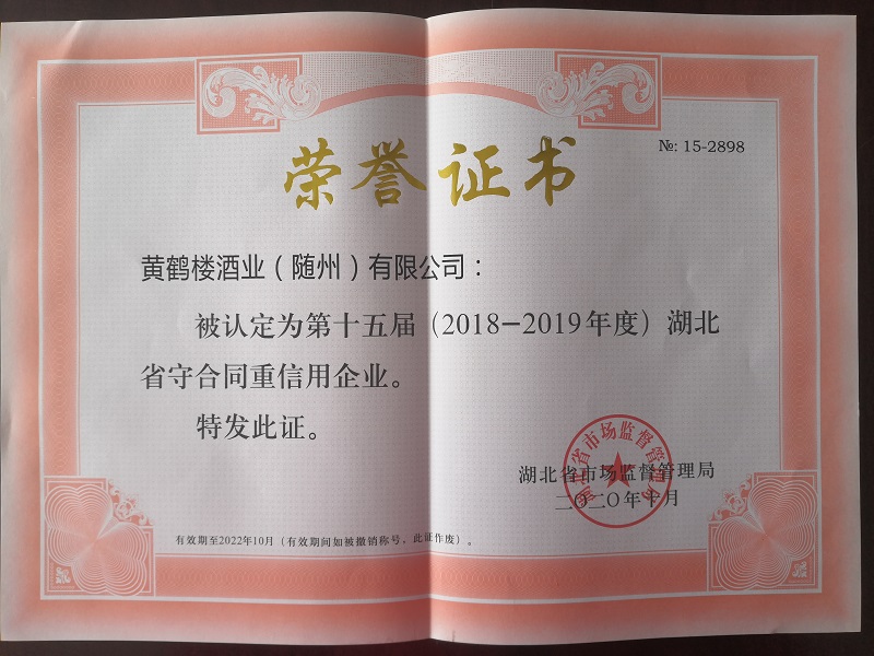 11月4日,隨州市市場監(jiān)督管理局授予黃鶴樓酒業(yè)(隨州)有限公司隨州市第十屆“守合同重信用”企業(yè)榮譽(yù)稱號并發(fā)放證書,代授湖北省第十五屆“守合同重信用”企業(yè)榮譽(yù)證書。