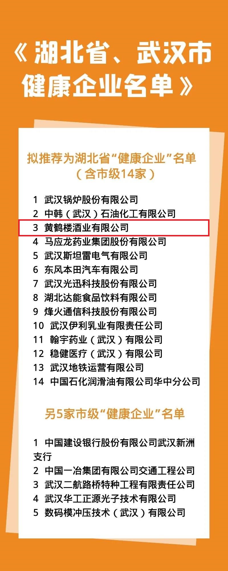 近日,2020年武漢市“健康企業”創建和評審結果揭曉。黃鶴樓酒業獲評市級“健康企業”榮譽,并將被推薦參評湖北省“健康企業”。