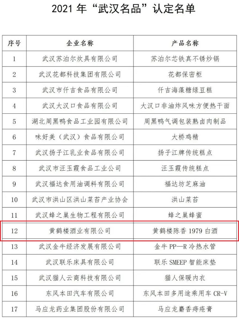 3月24日,2021年“武漢名品”認(rèn)定名單公布,黃鶴樓酒業(yè)“黃鶴樓陳香1979”榜上有名。