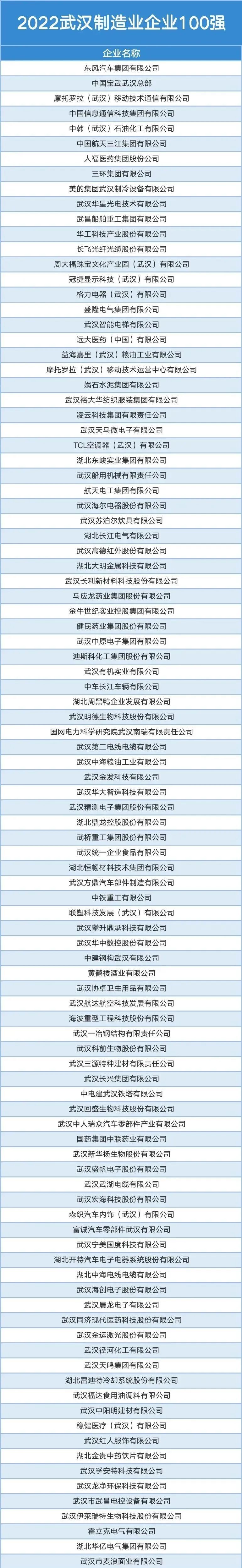 11月10日,《2022武漢企業(yè)100強、制造業(yè)企業(yè)100強、服務業(yè)企業(yè)100強分析報告》正式發(fā)布,公司成功入選《2022武漢制造業(yè)企業(yè)100強》。