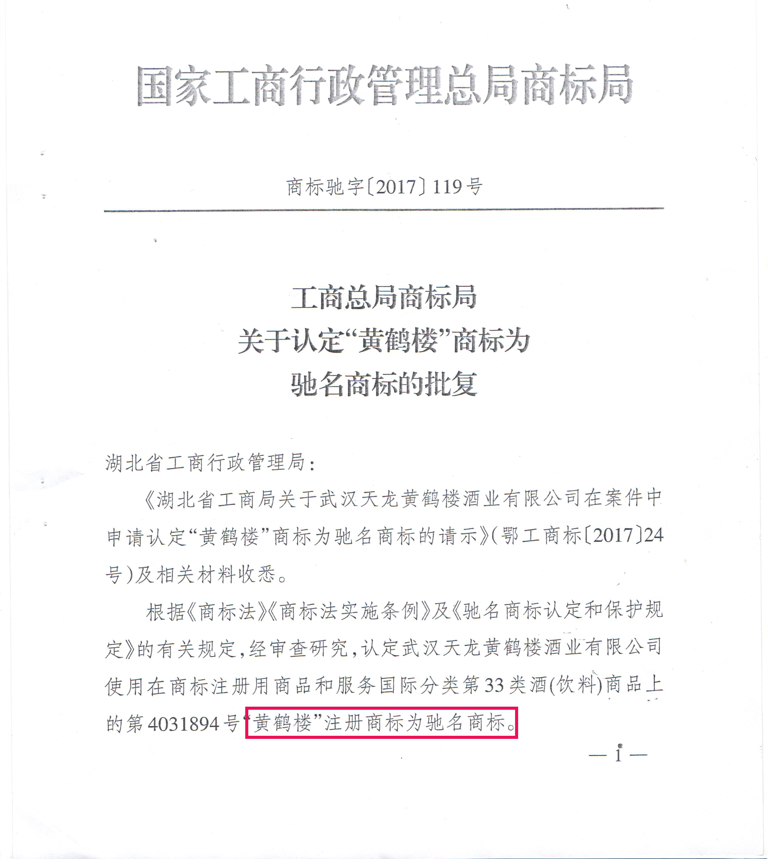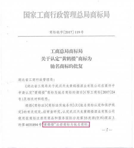 日前,公司收到國家工商行政管理總局商標局下發(fā)文件《商標馳字【2017】119號工商總局商標局關于認定“黃鶴樓”商標為馳名商標的批復》,文件中正式認定“黃鶴樓”商標為中國馳名商標。