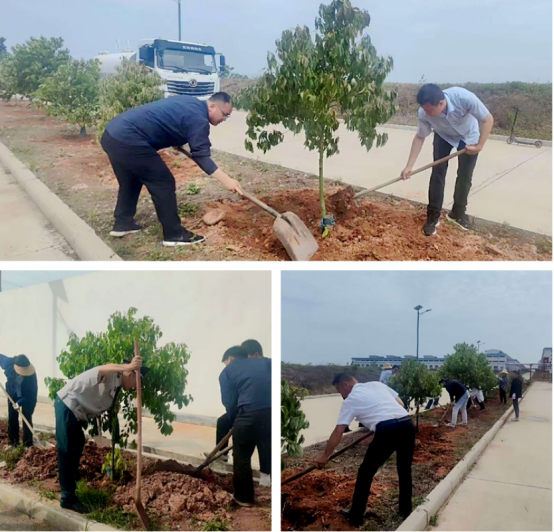 活動(dòng)現(xiàn)場,全體黨員分為挖樹、種樹兩隊(duì),挖樹隊(duì)手持工具,小心將樟樹從一號(hào)酒庫施工場地挖起;種樹隊(duì)則在污水處理站和糟場同步作業(yè),快速完成扶樹、澆水、填土等工序。最終,在大家的高效協(xié)作下,30余棵樟樹全部移栽到位,充分保障了一號(hào)酒庫的順利施工。